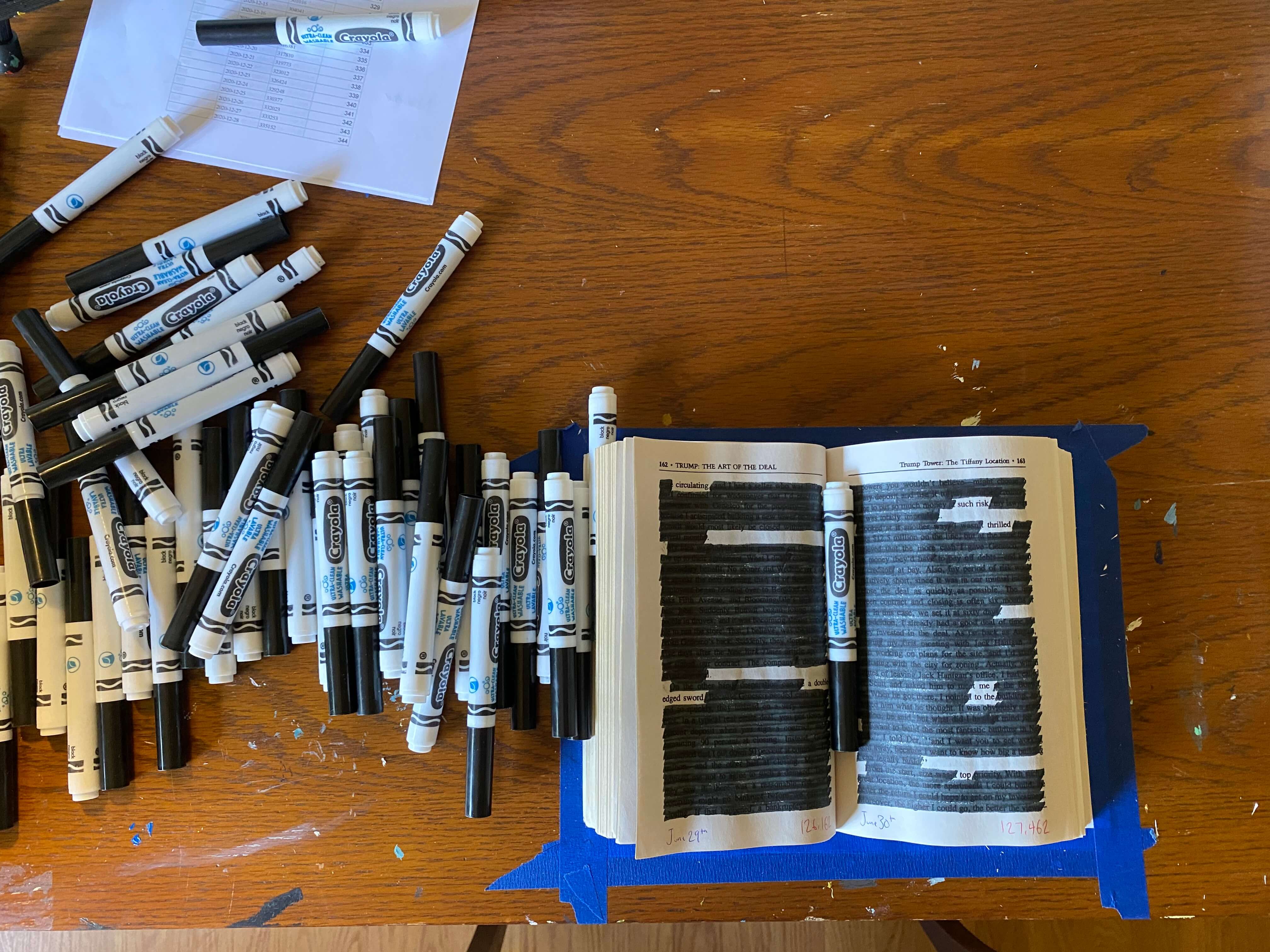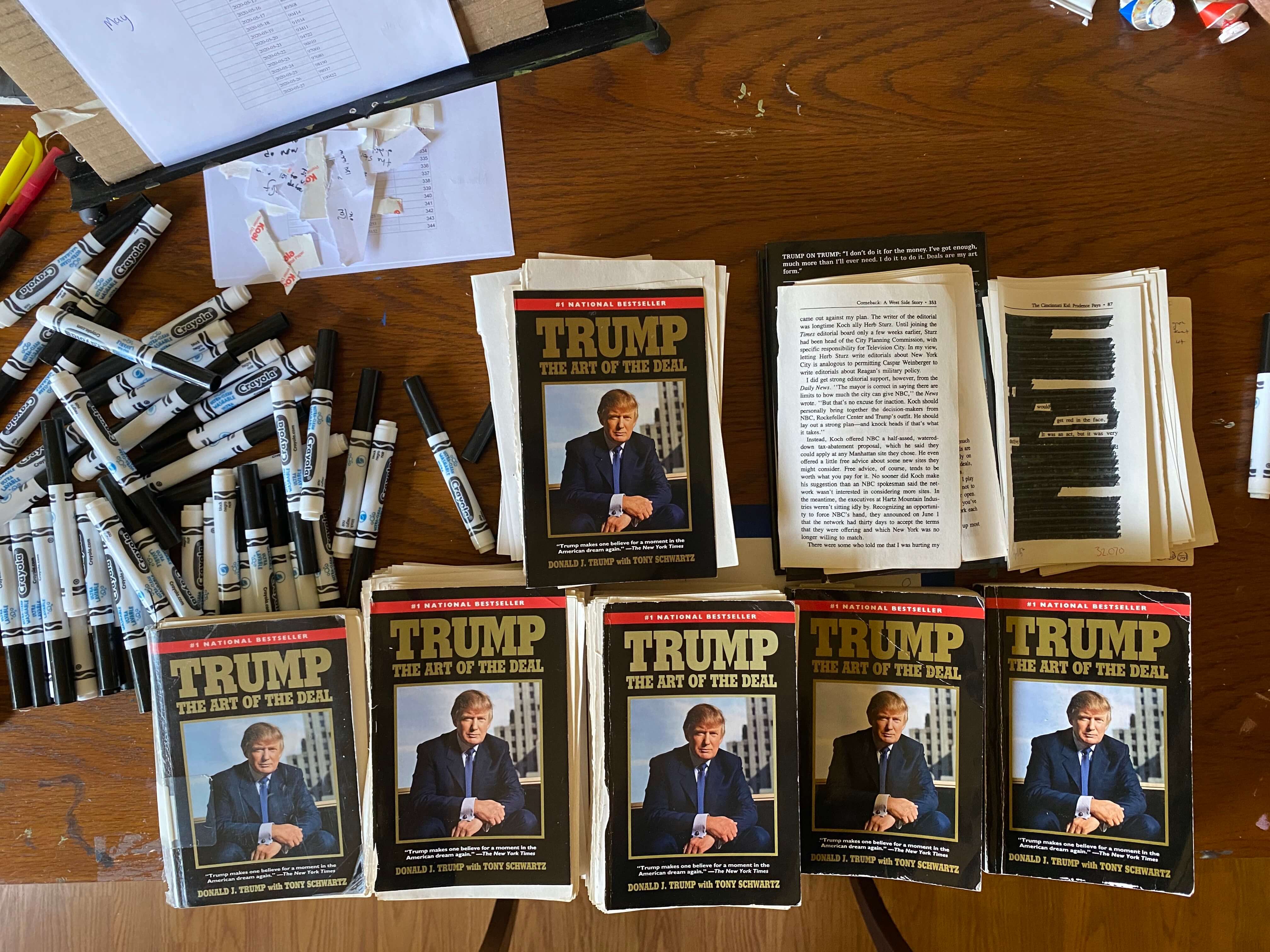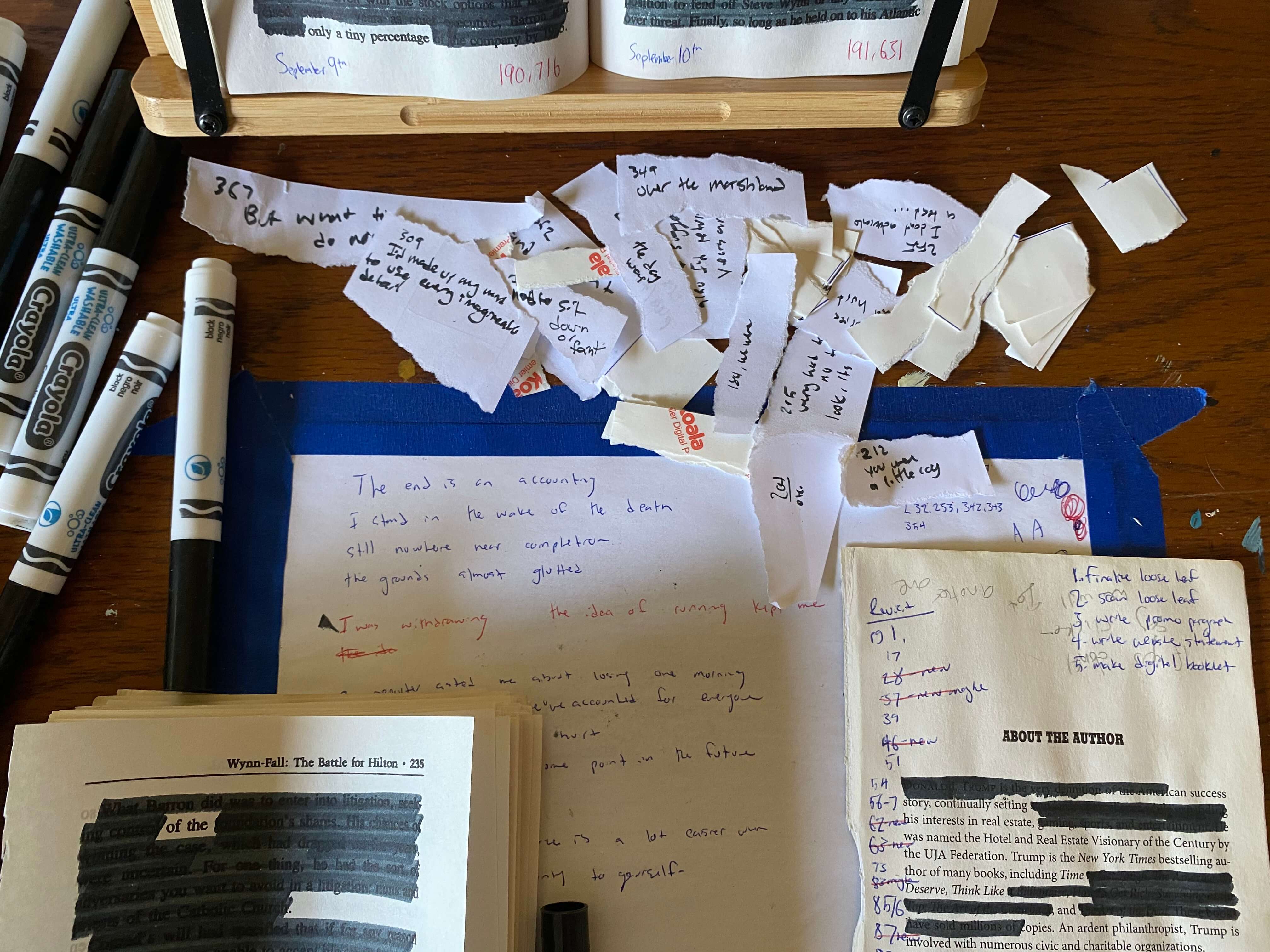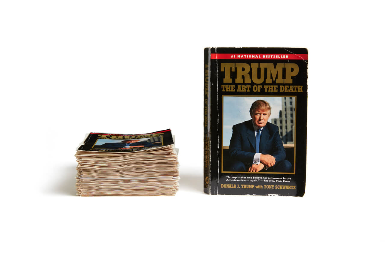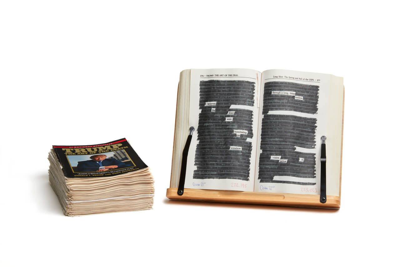What does The Art of the Death erase of an initial text so intent on misrepresentation that the ghostwriter, Tony Schwartz, has called it a "fictional frame"? This erasure has, I hope, performed a collective revision of the autobiography that centers the text on language previously submerged. As the first page of the last chapter reads: "the / end / is an accounting". A categorical that may only exist in a fictional frame, the erasure turns language over again & again, seeking a way forward, harrowed, through a harrowing year.